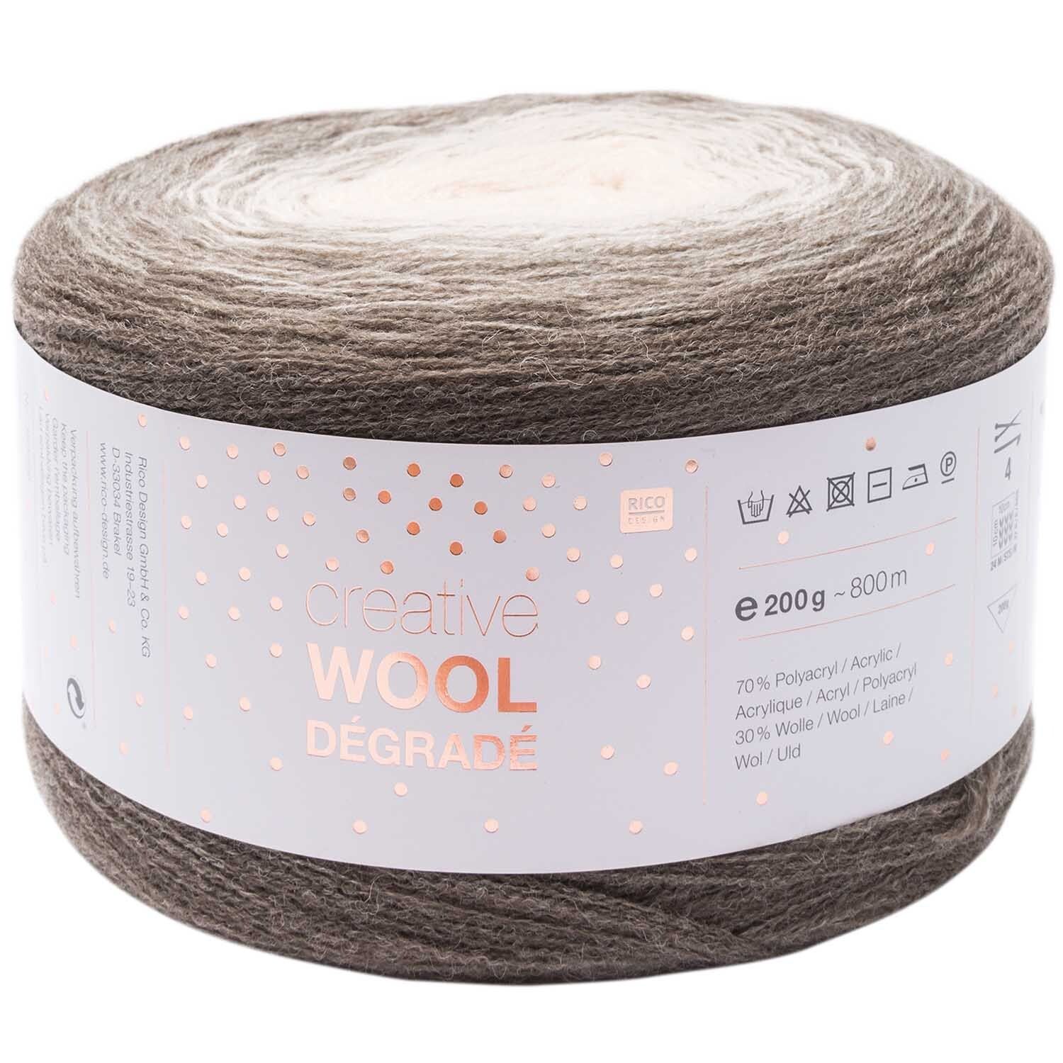 Como su nombre indica, la lana Creative Wool Dégradé de Rico Design crea prendas de punto con preciosos efectos degradados. Wool Dégradé es la versión más gruesa de Cotton Dégradé y resulta ideal para otoño e invierno. La lana se hila a partir de cuatro hebras finas en diferentes tonos que se mezclan para crear una impresionante combinación de colores. Pero no solo la lana impresiona; la madeja en sí es visualmente impactante: cada madeja está enrollada en forma de cilindro, dejando entrever el fascinante degradado de color.